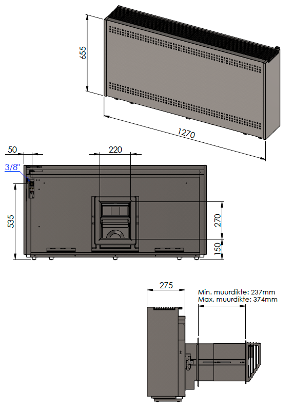 De Bocal P11 gevelkachel heeft een vermogen van maar liefst 10.5 kW. De buitenste buis dient voor de directe aanvoer van lucht van buiten en de verbrandingsgassen worden afgevoerd via de binnenste buis van dezelfde dubbelwandige constructie. Het voordeel van de gevelkachel is dat deze met zijn afvoer recht naar achteren door de buitenmuur mag. Hierdoor hoeft er geen buis binnen of buiten omhoog.