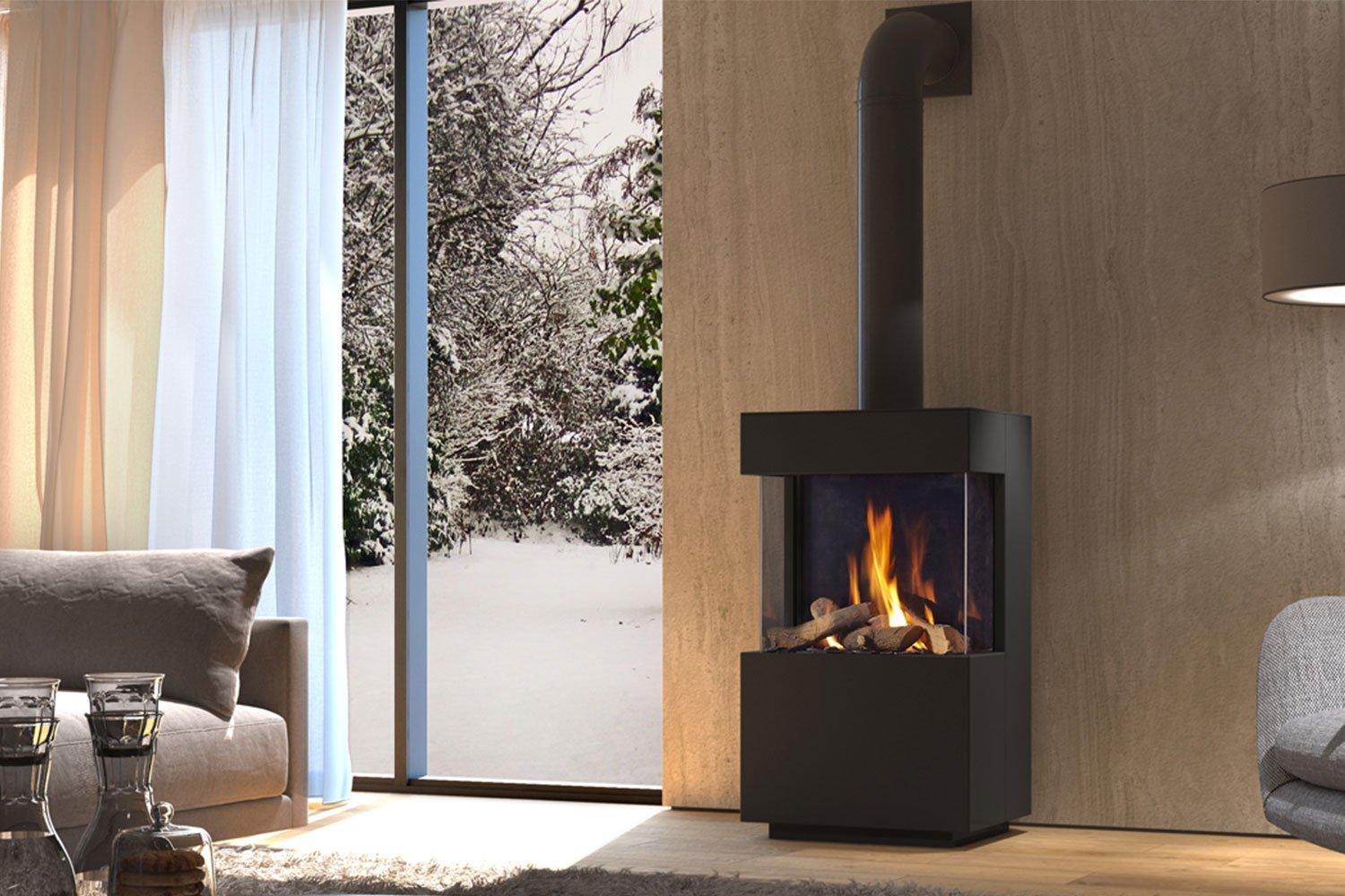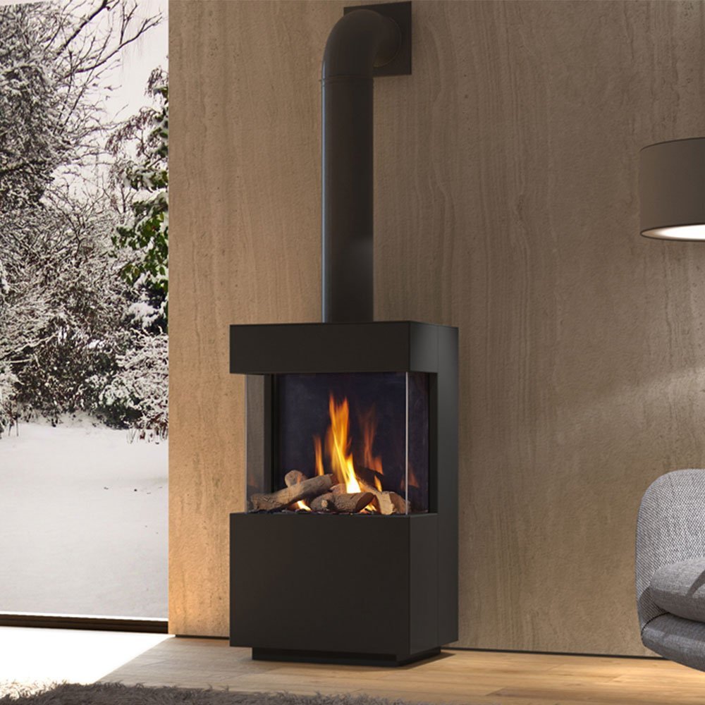 Natuurlijk dankt deze kachel zijn naam aan de drie ruiten. Deze drie ruiten geven een subliem zicht op het mooie vuur in deze gaskachel van DRU.