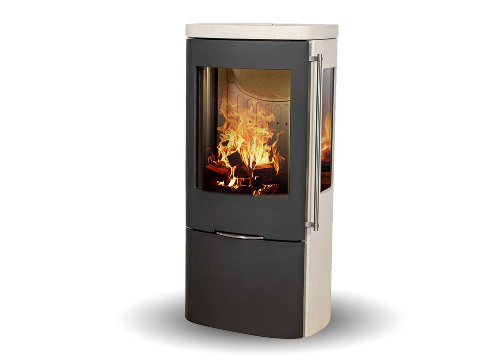 De Jydepejsen Senza zandsteen met zijruiten is een vrijstaande houtkachel die geschikt is voor ruimtes met een lage warmtebehoefte en goed geïsoleerde woningen. De kachel is gemaakt van hoogwaardig massief gietijzer en een zandstenen ombouw. Deze combinatie van materialen geeft de kachel een extra robuuste uitstraling en zorgt voor aangename stralings- en accumulatiewarmte. Bijpassend in het geheel is de zelfsluitende deur van eveneens massief gietijzer en een groot venster in het ontwerp verwerkt. De deur van de Senza houtkachel is zelfsluitend dankzij magneten en zorgt daarmee voor een soepele bediening. Afhankelijk van de gewenste uitstraling, zijn twee soorten handvaten beschikbaar. Uiteraard is de kachel ook voorzien van de nieuwste verbrandingstechnologie van Jydepejsen.