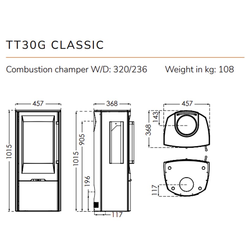 De TT30-serie is voor echte vuurliefhebbers. De deur, de bovenkant en de onderkant van de verbrandingskamer zijn gemaakt van gietijzer, een uiterst sterk materiaal dat de houtkachel een solide uiterlijk geeft. De houtkachel is slanker dan de andere modellen van TermaTech, waardoor hij licht van gewicht is, ondanks de keuze van stevig materiaal. Alle TT30-modellen hebben gemeen dat ze zowel boven als achter op de schoorsteen kunnen worden gemonteerd en aangesloten.