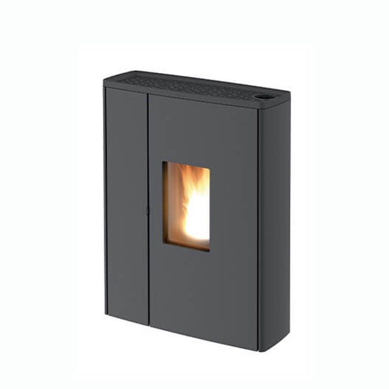 Kanaliseerbare pelletkachel, bijzonder geschikt voor gangen of kleine ruimtes, dankzij een diepte die vergelijkbaar is met die van een radiator (30 cm).