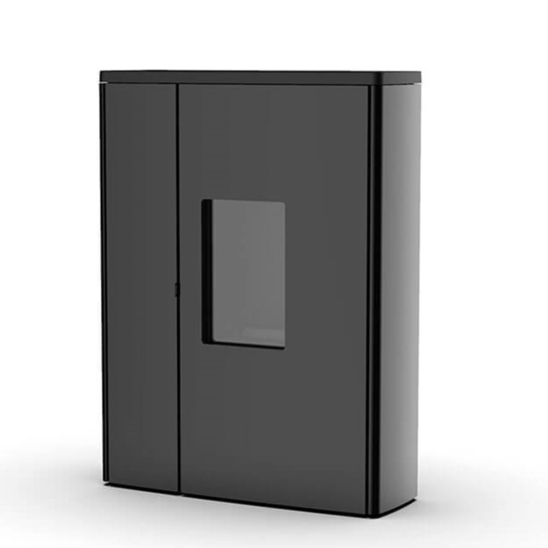 Het buitengewoon strakke frontpaneel, in zwart gelakt staal, biedt rechts plaats aan de stookruimte en links aan een deur die kan worden geopend om toegang te krijgen tot het pelletreservoir. Het bovenblad is gemaakt volgens een origineel geometrisch ontwerp en kan worden uitgevoerd in zwart gelakt gietijzer of aluminium. Verkrijgbaar met rookuitlaat aan de achterkant of aan de bovenkant (UP! versie).