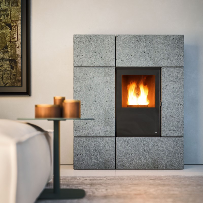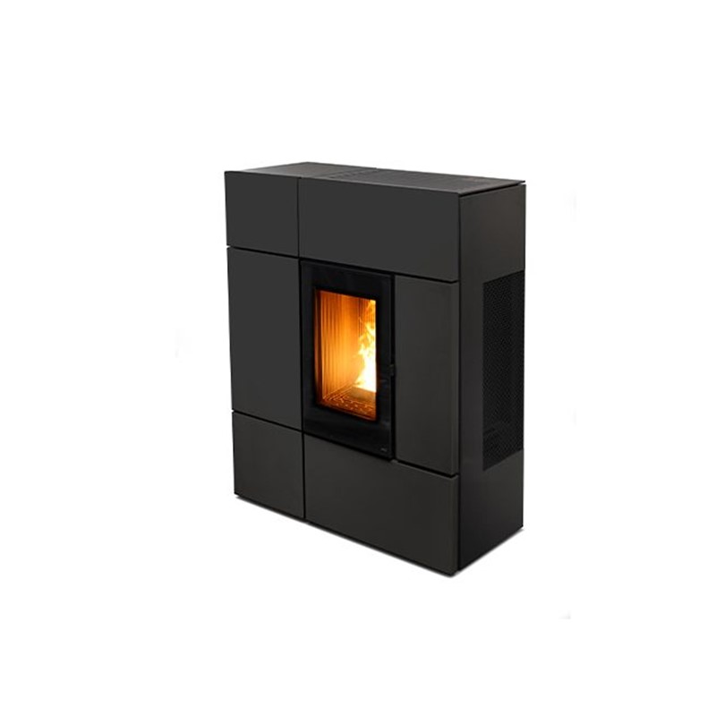 Kanaliseerbare pelletkachel zonder ventilatieopeningen vooraan, uitgevoerd met een gelakt stalen constructie, glazen deur en frontale bekleding in serpentijn of gelakt staal in de kleuren wit, bordeaux, zwart. Vuurpot in gietijzer.