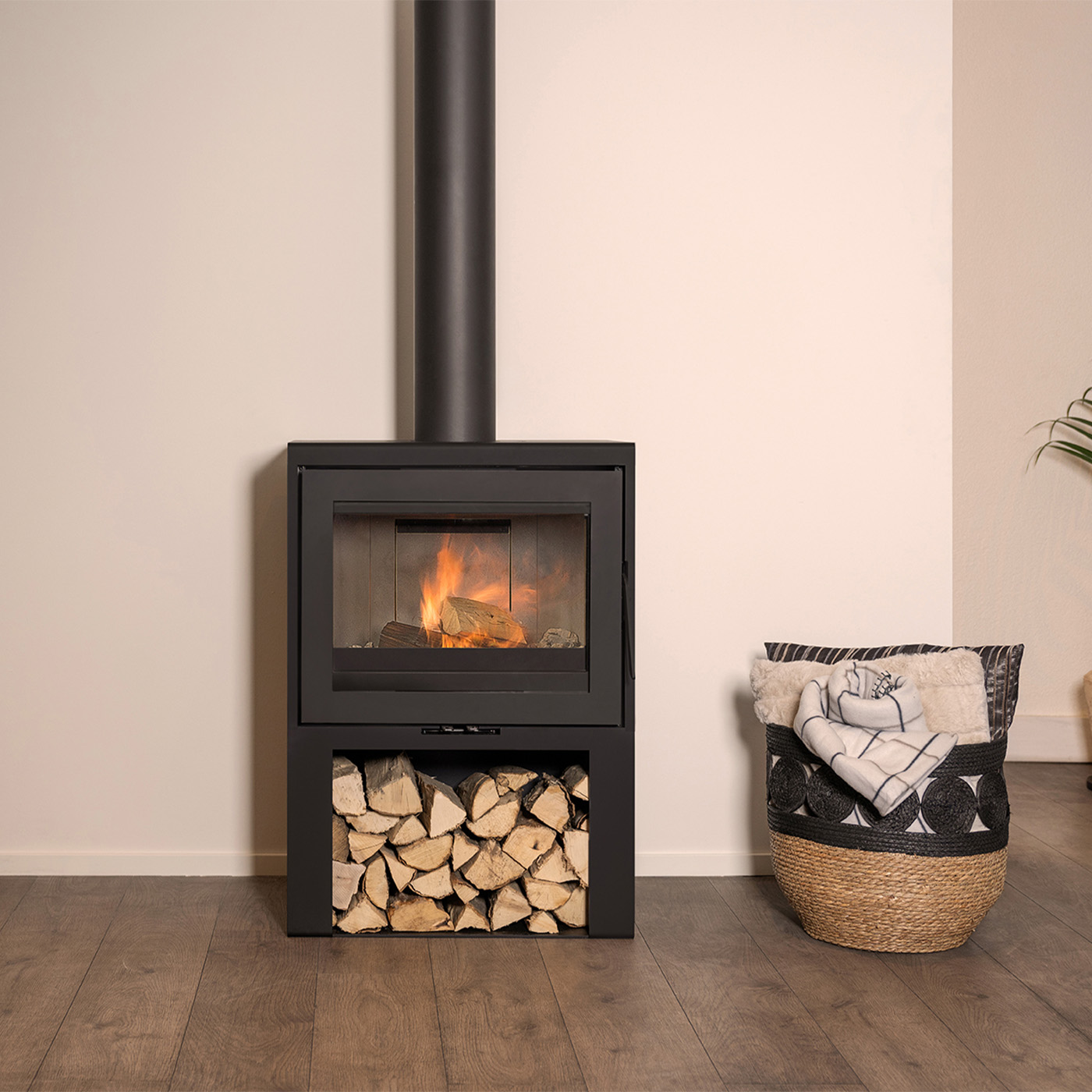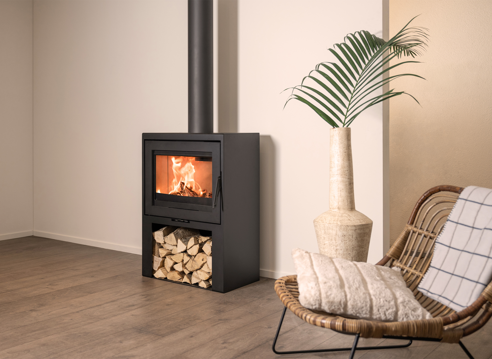 Onder de kachel is er ruimte voor het opslaan van brandhout, wat vanuit praktisch oogpunt, maar ook als decoratief oogpunt een groot pluspunt is. De houtkachel is voorzien van een losse minimalistische handgreep die zorgt voor een strakke look zonder zichtbare hendels. Deze kan optioneel vast gemonteerd worden.